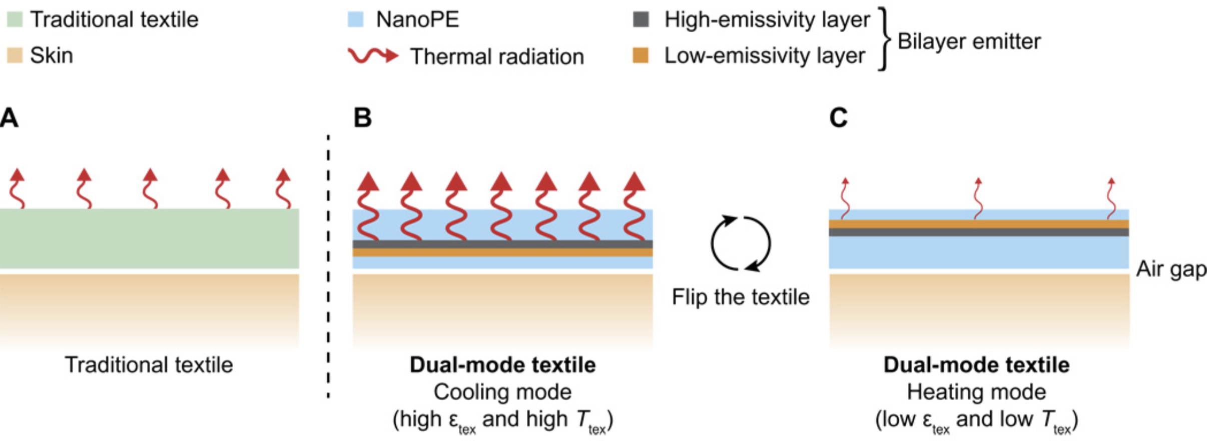 The dual-mode textile is composed of a bilayer emitter