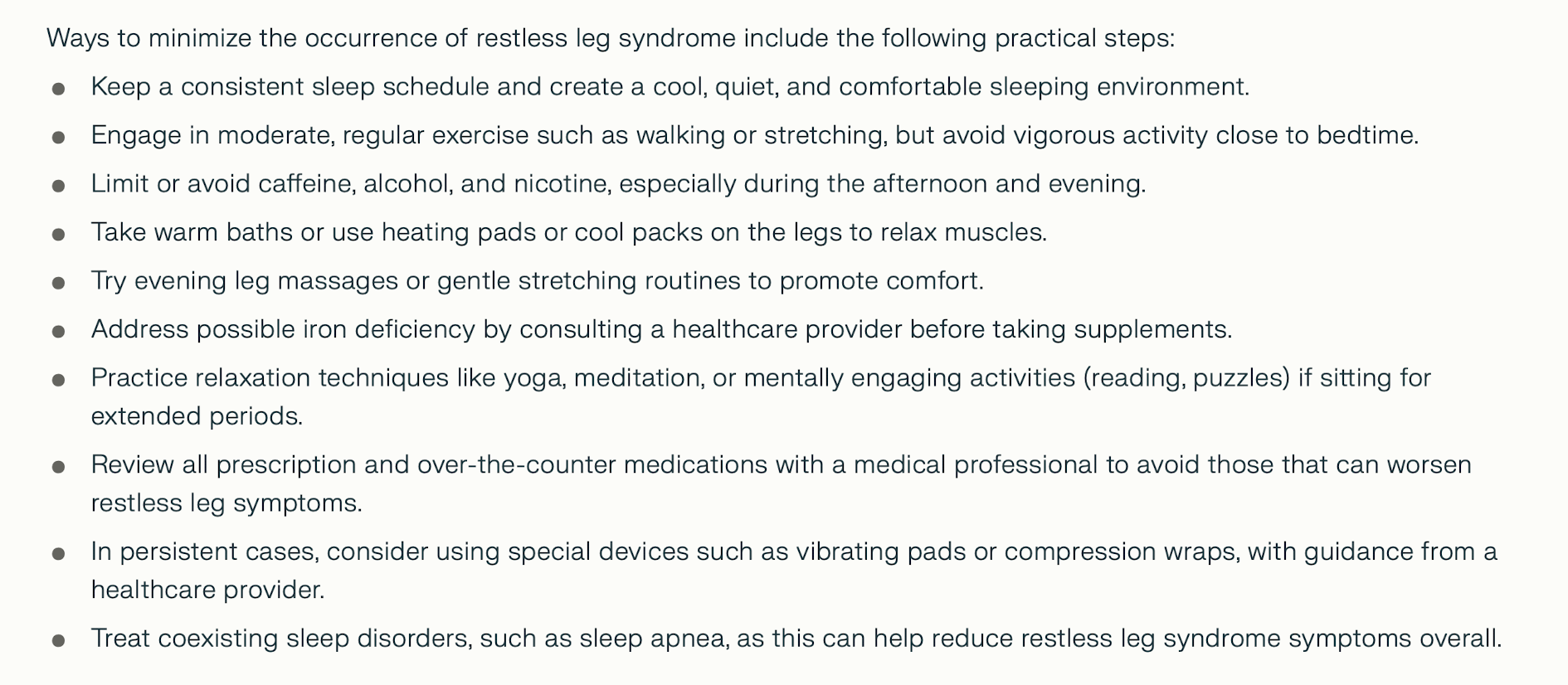 Mayo Clinic: Restless legs syndrome https://www.mayoclinic.org/diseases-conditions/restless-legs-syndrome/symptoms-causes/syc-20377168 Restless legs syndrome (RLS) is a condition that causes an uncontrollable urge to move the legs, usually because of an uncomfortable sensation. It typically happens in the evening or nighttime hours when you're sitting or lying down. Moving eases the unpleasant feeling temporarily. Restless legs syndrome, also known as Willis-Ekbom disease, can begin at any age and generally worsens as you age. It can disrupt sleep, which interferes with daily activities. Simple self-care steps and lifestyle changes may help relieve symptoms. Medications also help many people with RLS. NIH: Restless legs syndrome https://www.ninds.nih.gov/health-information/disorders/restless-legs-syndrome sam.wormley@icloud.com